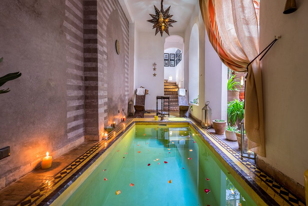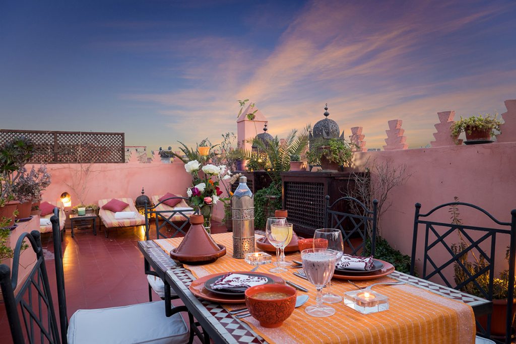 Our small boutique hotel is a traditional Moroccan house radically renovated and furnished with antiques, art objects and decorations in a clever mix of ethnic african ideas and European sophistication. It has 5 bedrooms marked by the “spirit of Morocco”. The patio, shaded by palm trees and bougainvillea, has a small pool, the terrace is ideal for sunbathing and cooling off in the tadelakt tub. Delicious breakfast with homemade goodies. You have to try absolutely our gourmand cuisine, varied and never boring, played between tradition and creativity.
